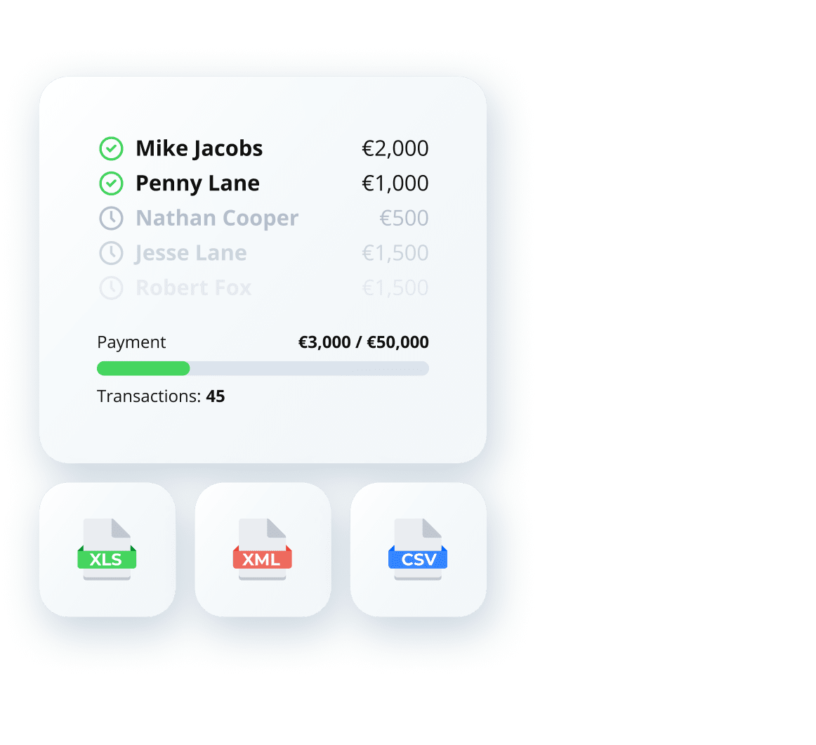 The Wallester platform allows for seamless integration with the company accounting systems. The prepared list of payments can be directly uploaded from the payroll or accounting system. This can be done in the most convenient XML format or simplified XLS or CSV formats.